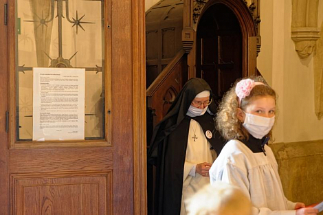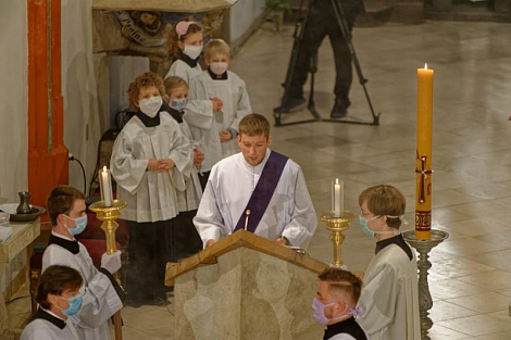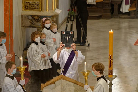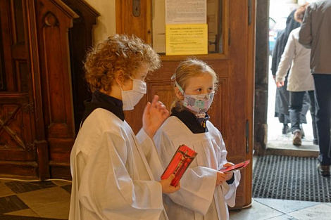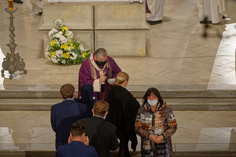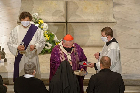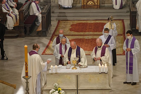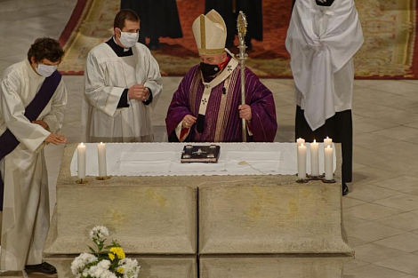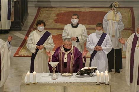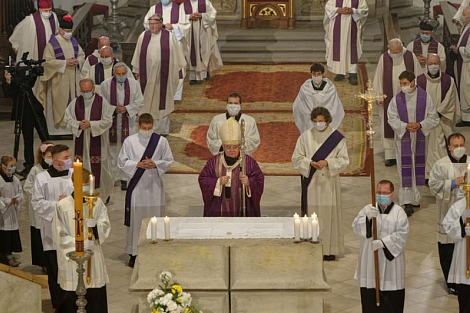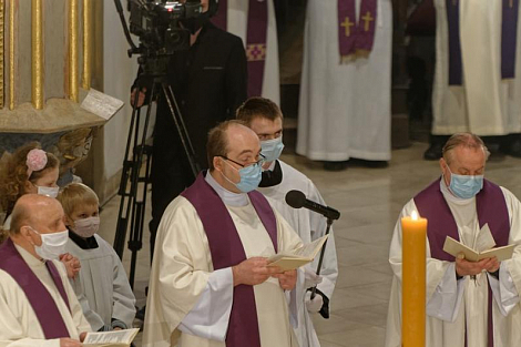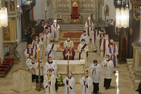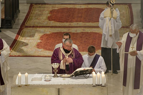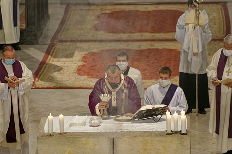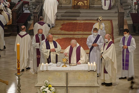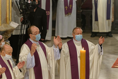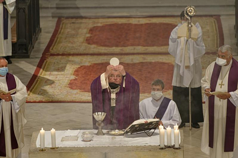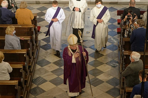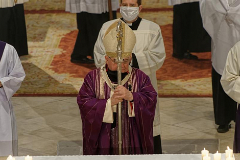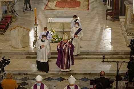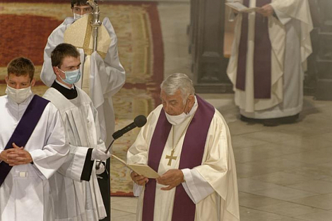 Za výrazných organizačních omezení, nutných z důvodu pandemie, začala v královéhradecké katedrále v 10 hod. mše svatá, které předsedal Otčenáškův nástupce v Hradci Králové, pražský arcibiskup Dominik Duka OP. Spolu s ním u obětního stolu koncelebroval současný královéhradecký diecézní biskup Jan Vokál a pomocný biskup Josef Kajnek.