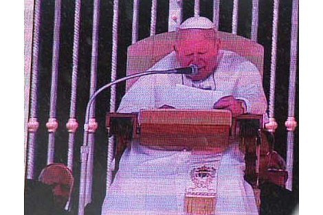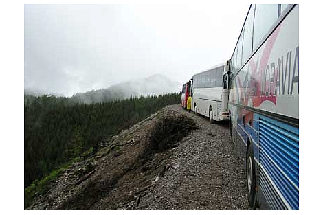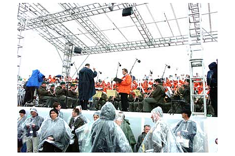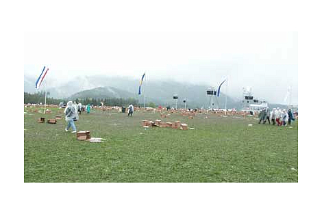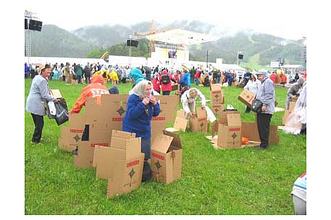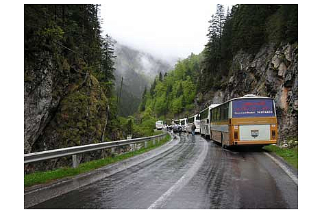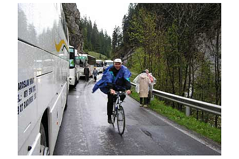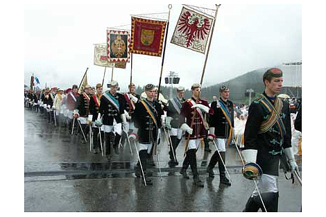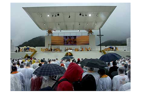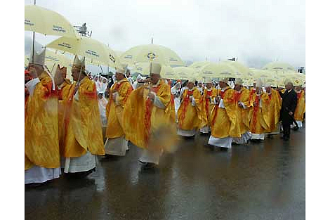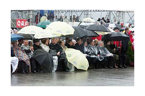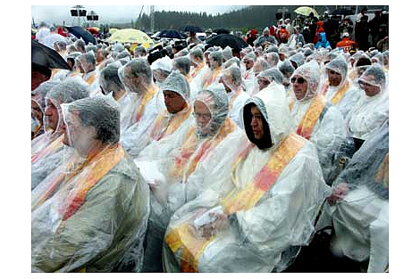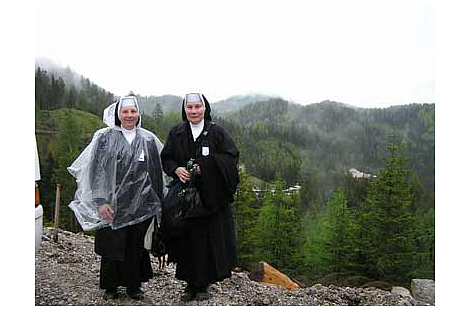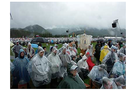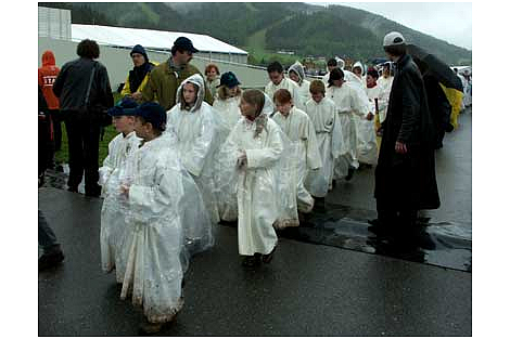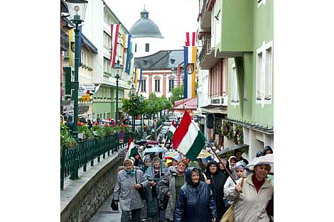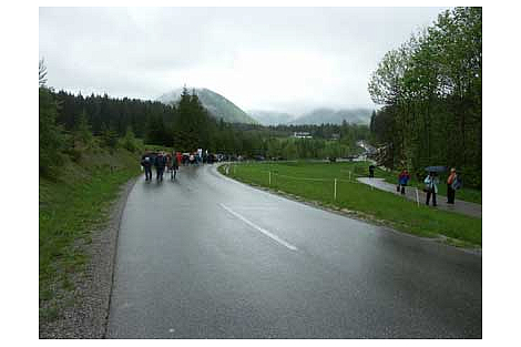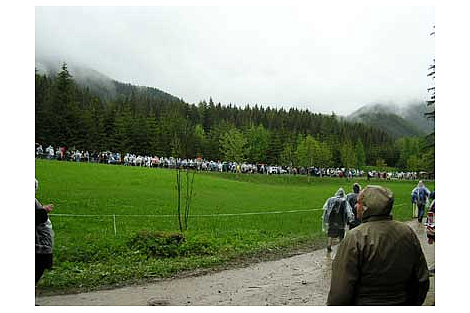 Křesťané odedávna putovali na posvátná místa, aby děkovali Bohu za přijatá dobrodiní a prosili ho o pomoc a ochranu. Hlavním dnem pouti středoevropských národů do Mariazell, byla sobota 22. května 2004, kdy vyrcholil projekt Středoevropských katolických dnů, byla poděkováním za osvobození z komunistické diktatury a přijetí do evropského společenství národů. Na snímku - pohled na cestu, po které se za nepříznivého počasí blíží poutníci od západu.