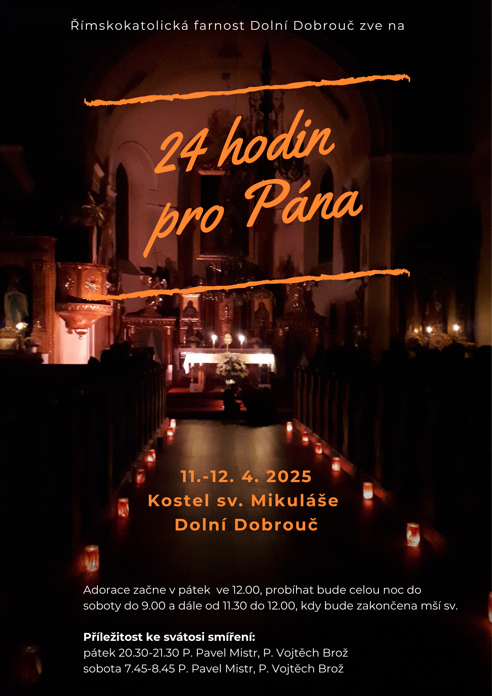 24 HODIN PRO PÁNA je v naší farnosti přesunuta na pátek 11.4., kdy začne modlitbou Anděl Páně ve 12.00 a následným výstavem Nejsvětější svátosti. Adorace bude probíhat odpoledne a celou noc až do soboty 12.4. do 12.00, kdy bude zakončena mší sv. Během duchovní obnovy bude adorace přerušena, ale bude nahrazena duchovní obnovou. Svátost smíření: pátek 20.30-21.30 P. Pavel Mistr, P. Vojtěch Brož sobota 7.45-8.45 P. Pavel Mistr, P. Vojtěch Brož