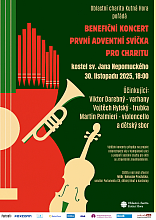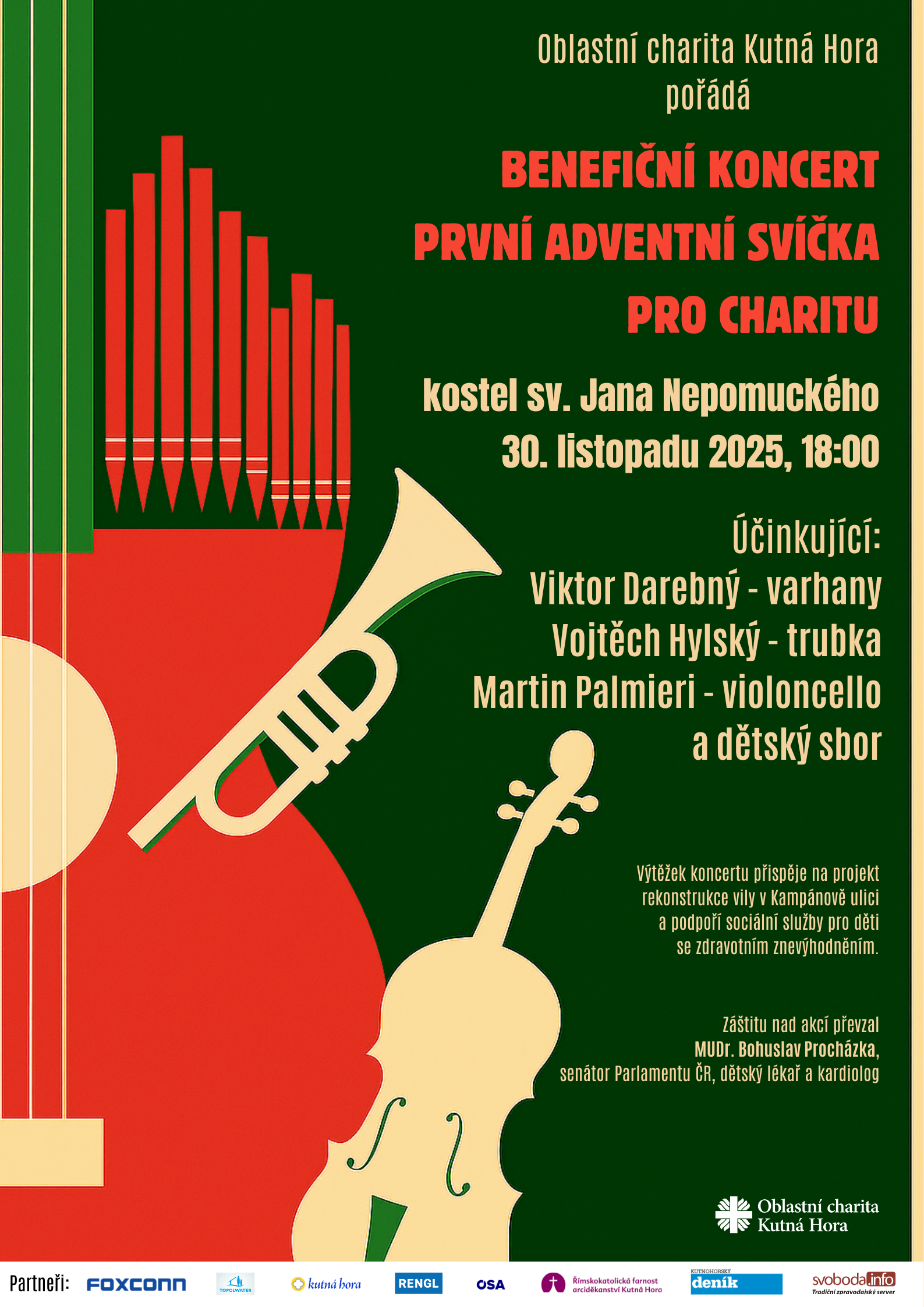 Benefiční koncert První adventní svíčka pro Charitu se uskuteční v neděli 30. listopadu 2025 od 18:00 v kostele sv. Jana Nepomuckého v Kutné Hoře. Hlavní část večera rozezní tóny varhan, trubky a violoncella v podání kutnohorských umělců Viktora Darebného, Vojtěcha Hylského a Martina Palmieri. Na úvod vystoupí dětský farní sbor pod vedením Kateřiny Grenarové, který svým zpěvem umocní slavnostní atmosféru zapálení první adventní svíce. Vstupné je dobrovolné. Výtěžek pomůže financovat rekonstrukci vily v Kampanově ulici a podpoří ranou péči a aktivizační službu pro rodiny s dětmi se zdravotním znevýhodněním ve Středisku Na Sioně. Záštitu nad koncertem převzal senátor Parlamentu ČR MUDr. Bohuslav Procházka, dětský lékař a kardiolog. Přijďte si užít chvíli ztišení, poslechnout krásnou hudbu a setkat se s lidmi s otevřeným srdcem. Těšíme se na vás.