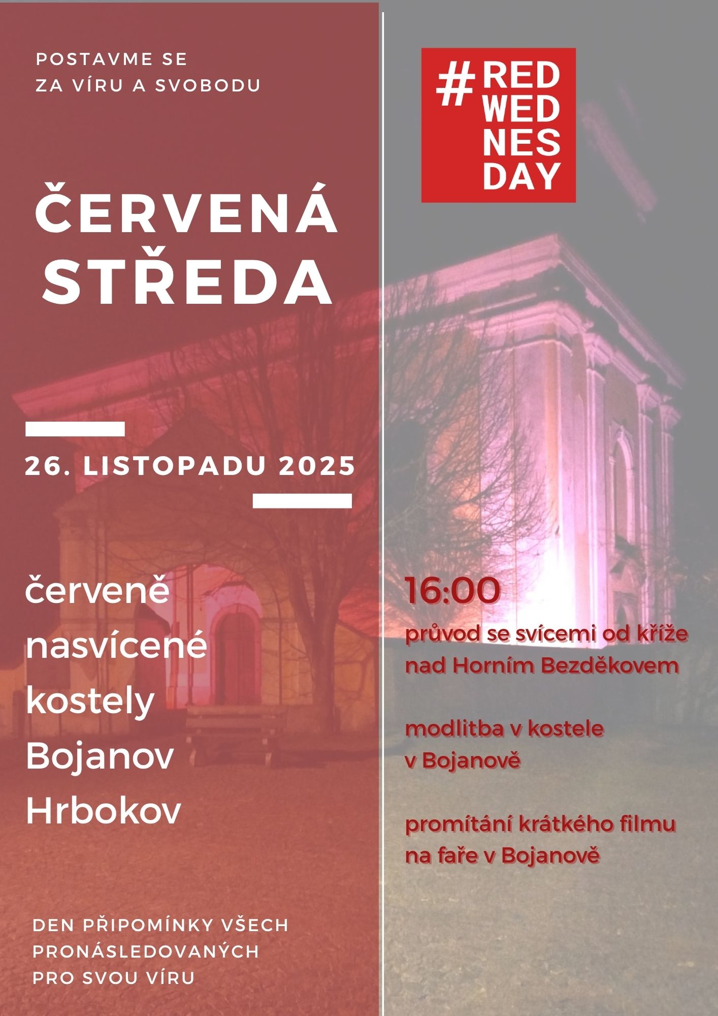 Připojíme se k mezinárodní připomínce pronásledovaných pro víru červeně nasvícenými kostely v Hrbokově a v Bojanově, společným průvodem od kříže nad Horním Bezděkovem do kostela v Bojanově, kde naše setkání zakončíme modlitbou. Pro zájemce je dále připraveno krásné promítání filmu na faře.