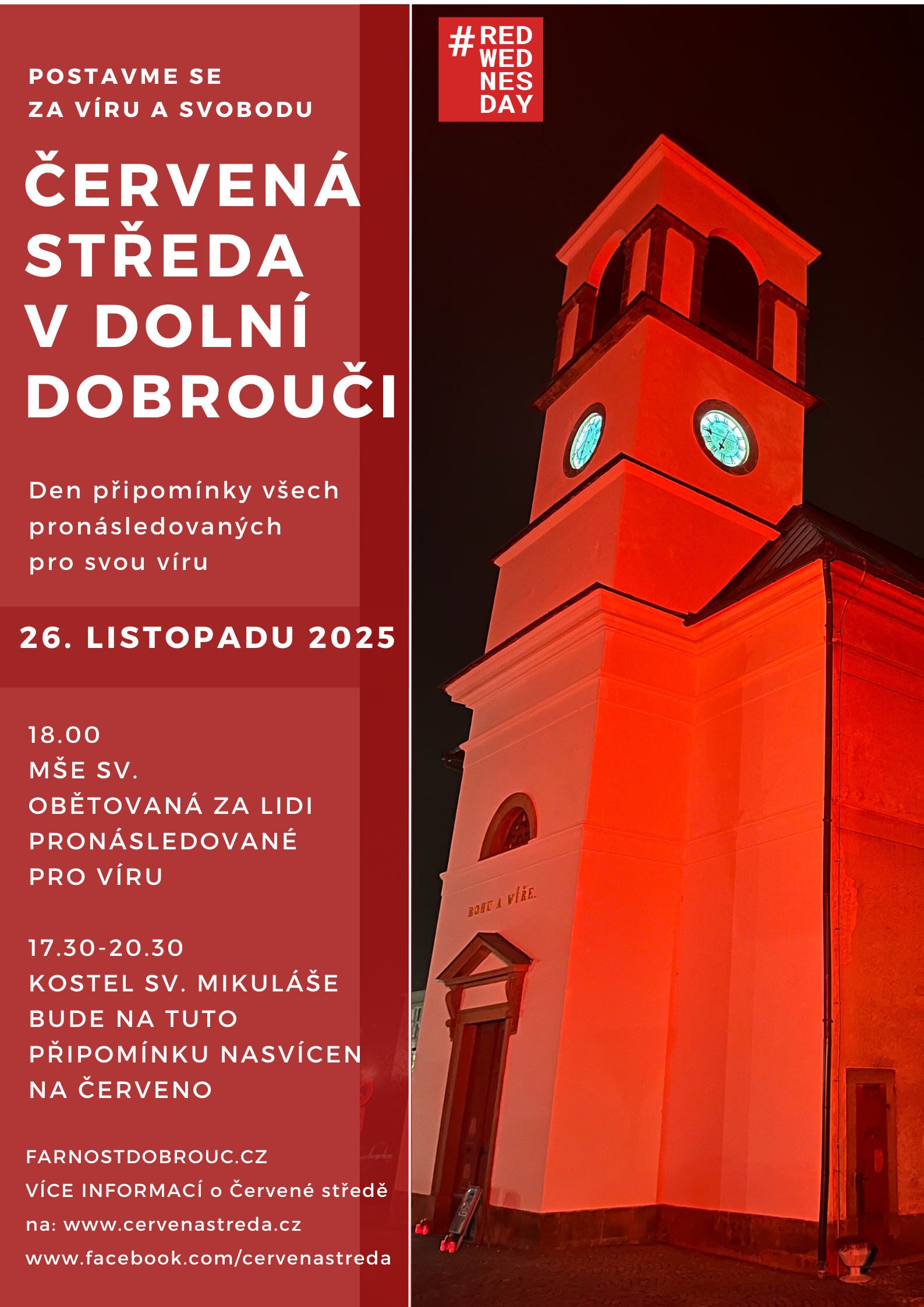V Dolní Dobrouči si i letos v rámci Červené středy připomeneme lidi pronásledované pro víru. Kostel sv. Mikuláše bude nasvícen na červeno a v 18.00 bude na tento úmysl slavena mše sv.