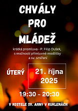 Zveme mládež ke společné modlitbě chval s možností přímluvné modlitby a sv. smíření. Krátkou promluvu bude mít P. Filip Dušek.