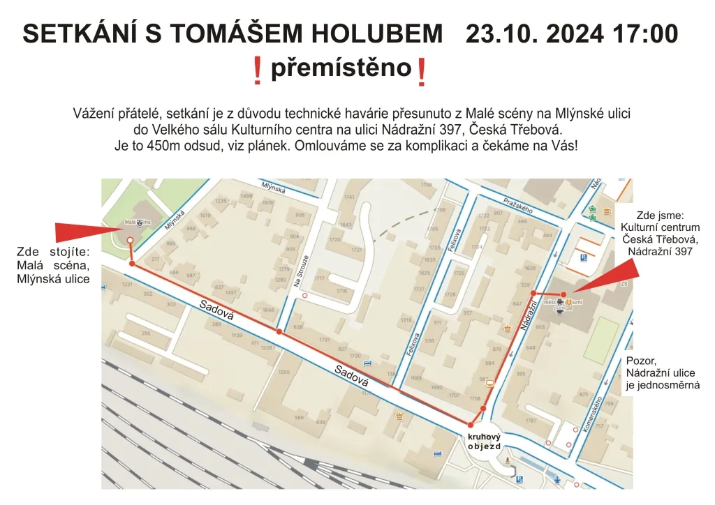 Setkání je z důvodu technické havárie přesunuto z Malé scény Mlýnské ulici do Velkého sálu Kulturního centra na ulici Nádražní 397, Česká Třebová.