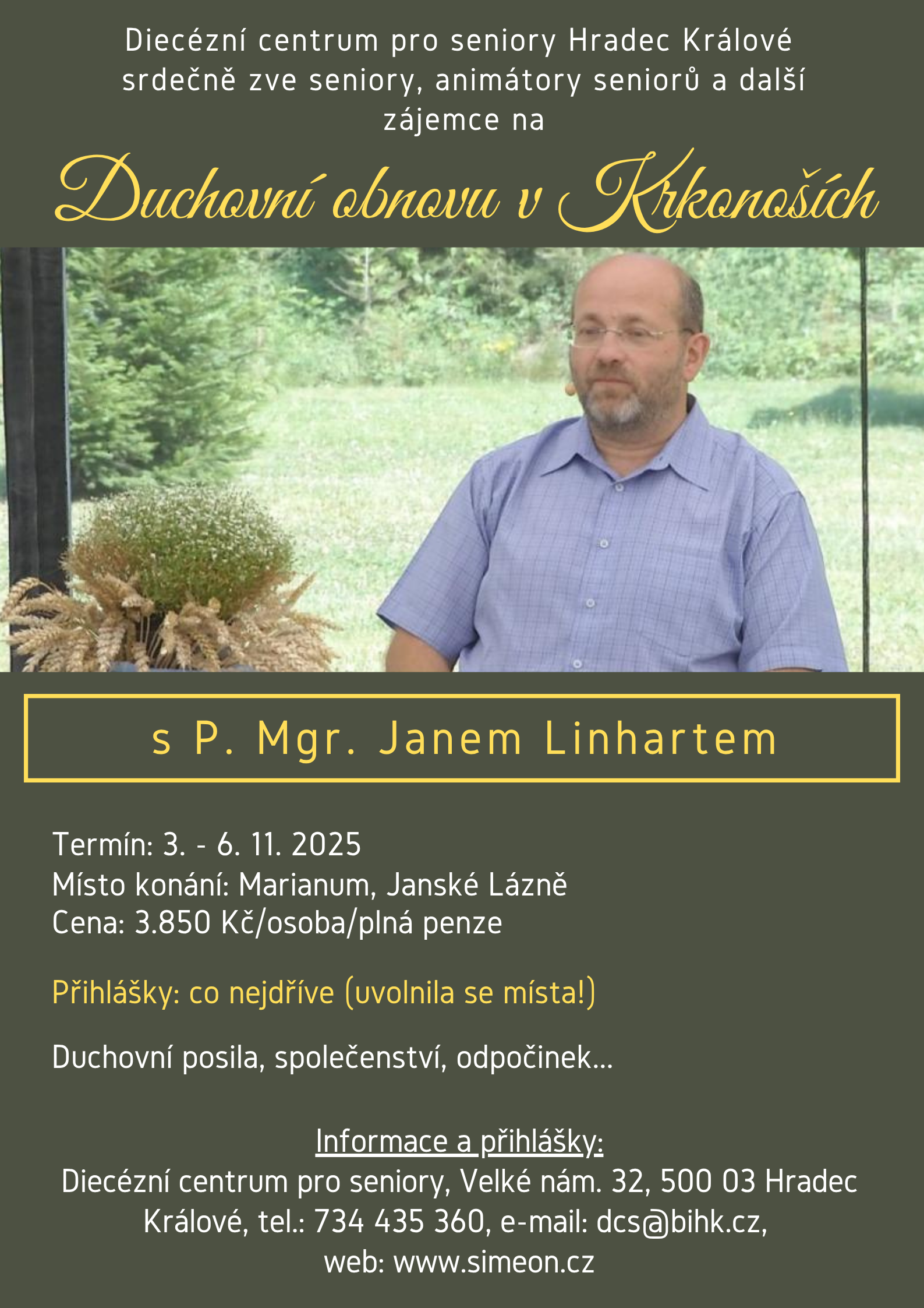 Diecézní centrum pro seniory Hradec Králové zve zároveň seniory, jejich animátory a další zájemce na duchovní obnovu s oblíbeným přednášejícím P. Mgr. Janem Linhartem. Uskuteční se v termínu 3. - 6. 11. 2025 v penzionu Marianum v Janských Lázních. Aktuálně se uvolnila místa, jsou poslední volná!