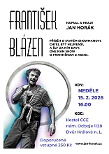 Příběh o svatém showmanovi. One man show o sv. Františku z Assisi, který chtěl být skromný - a šly za ním davy. Autorský projekt inspirovaný narativním divadlem Daria Fo. Když František kázal, tak při tom tančil a zpíval, proto je i vyprávění o Františkovi roztančené a rozezpívané. Byl to svým způsobem extremista; když plnil svoje poslání, tak nešetřil tělo, a tak se taky snažím moc nešetřit a zkoumat hranice svých sil. https://www.jan-horak.cz/repertoire/frantisek-blazen/