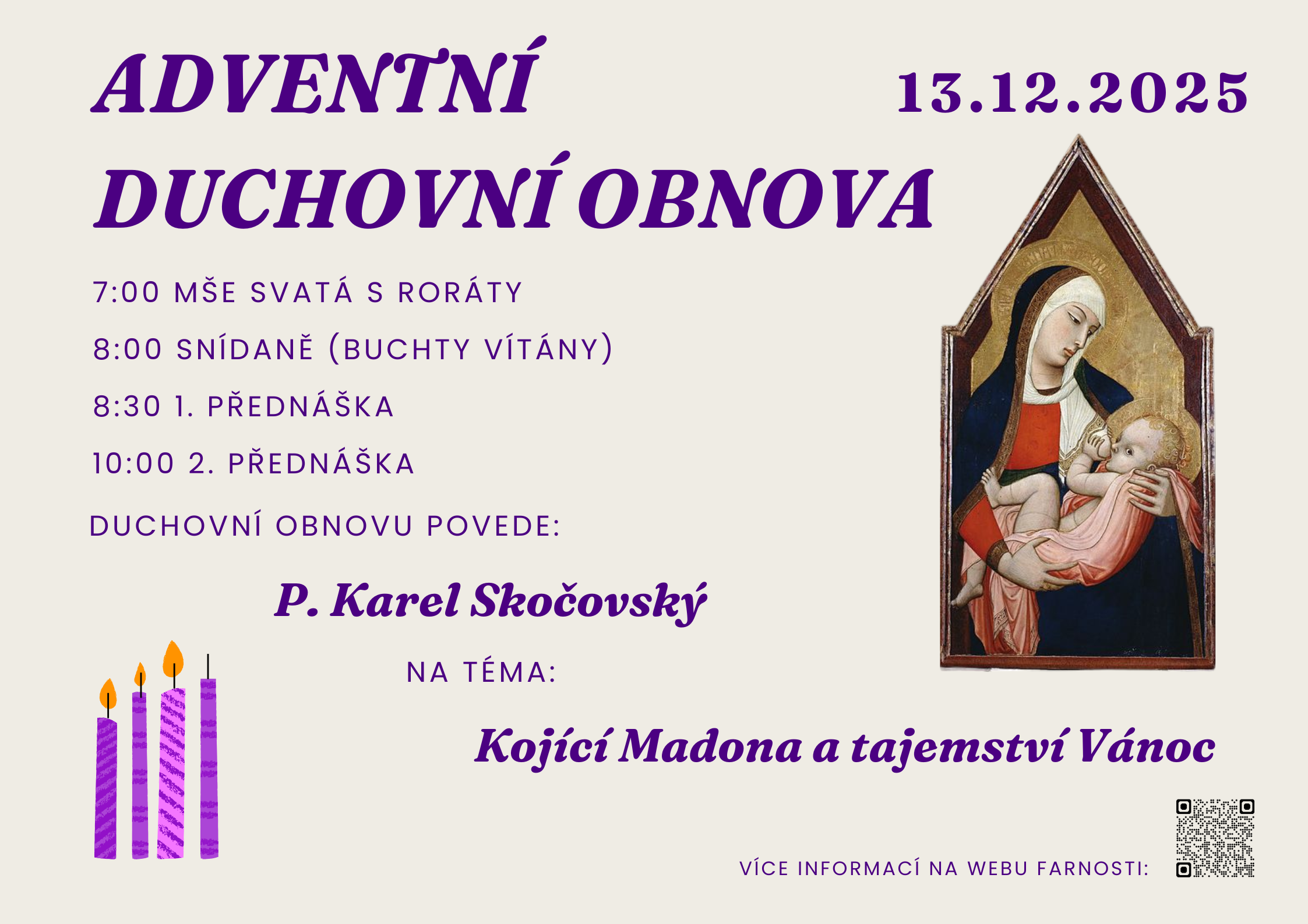 Obraz Panny Marie kojící Ježíška, známý jako Maria lactans, je prostým, ale současně hlubokým vyjádřením tajemství Vánoc. Ukazuje na pokoru Božího Syna, který se z lásky k nám stal člověkem – dokonce malým dítětem. Odkrývá nám Mariino mateřské, něžné srdce, které se otevřelo Boží milosti a spolupráci při Vtělení. Pod křížem pak přijalo Ježíšovy „bratry“ a „sestry“, které on zrodil v bolestech své smrti a díky vítězství svého vzkříšení. Kojící Madona nám pomáhá pochopit eucharistický rozměr mateřství a mateřský rozměr Eucharistie. Program: 7:00 mše svatá s roráty 8:00 snídaně (buchty vítány) 8:30 1. přednáška 10:00 2. přednáška