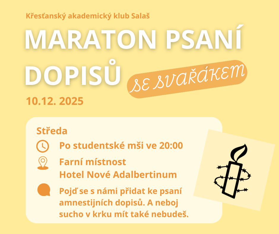 Společně budeme psát dopisy na podporu lidí pronásledovaných nebo souzených za svůj názor, víru či postoj. Možná je to jen pár vět, které napíšeš, ale i tak mohou někomu skutečně pomoci. Přijď se na chvíli zastavit, připojit svou podporu a ukázat, že lidskost má stále sílu. Těšíme se na Tebe!
