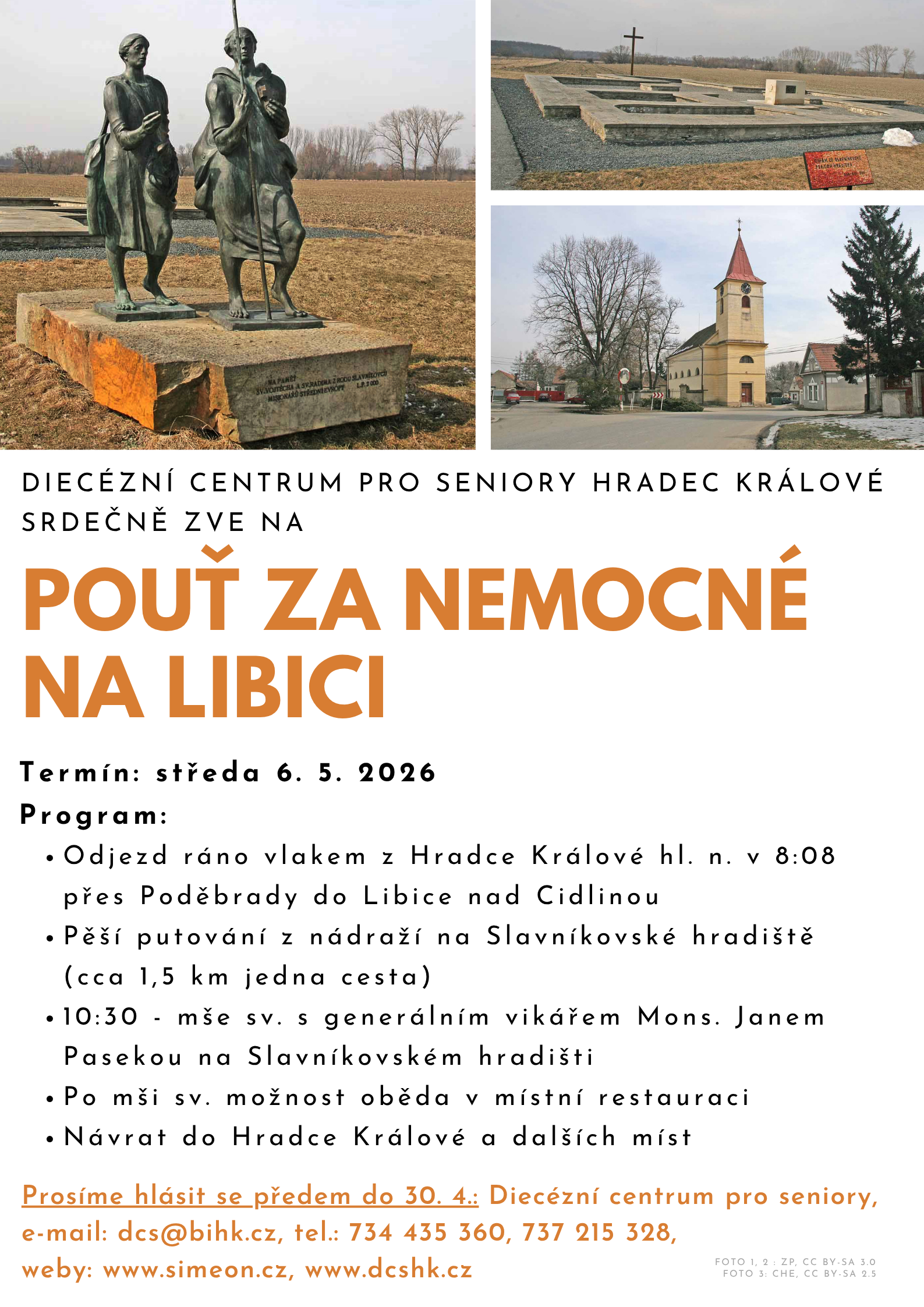 Na letošní Pouť za nemocné se vydáme ve středu 6. 5. 2026. Krátce po osmé hodině ranní vyjedeme vlakem z hlavního nádraží v Hradci Králové přes Poděbrady do Libice na Cidlinou. Pěší putování z tamního nádraží na slavníkovské hradiště je poklidná, asi 1,5 dlouhá procházka. O půl jedenácté začne mše svatá s generálním vikářem Mons. Janem Pasekou. Poté bude možnost oběda v místní restauraci a návrat do Hradce Králové.