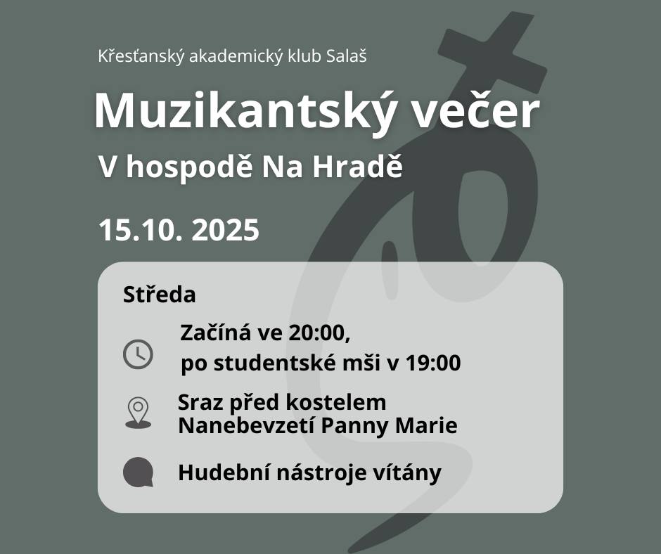 Po studentské mši ještě nekončíme! Tentokrát zveme všechny muzikanty i posluchače na přátelský večer plný písniček a dobré nálady. Sejdeme se v hospodě Na Hradě, kde si společně zazpíváme, zahrajeme a strávíme čas v radosti a společenství. Ať už vezmeš do ruky kytaru nebo se přidáš jen hlasem, jsi vítán! Přijď si odpočinout po náročném dni a potkat nové přátele.