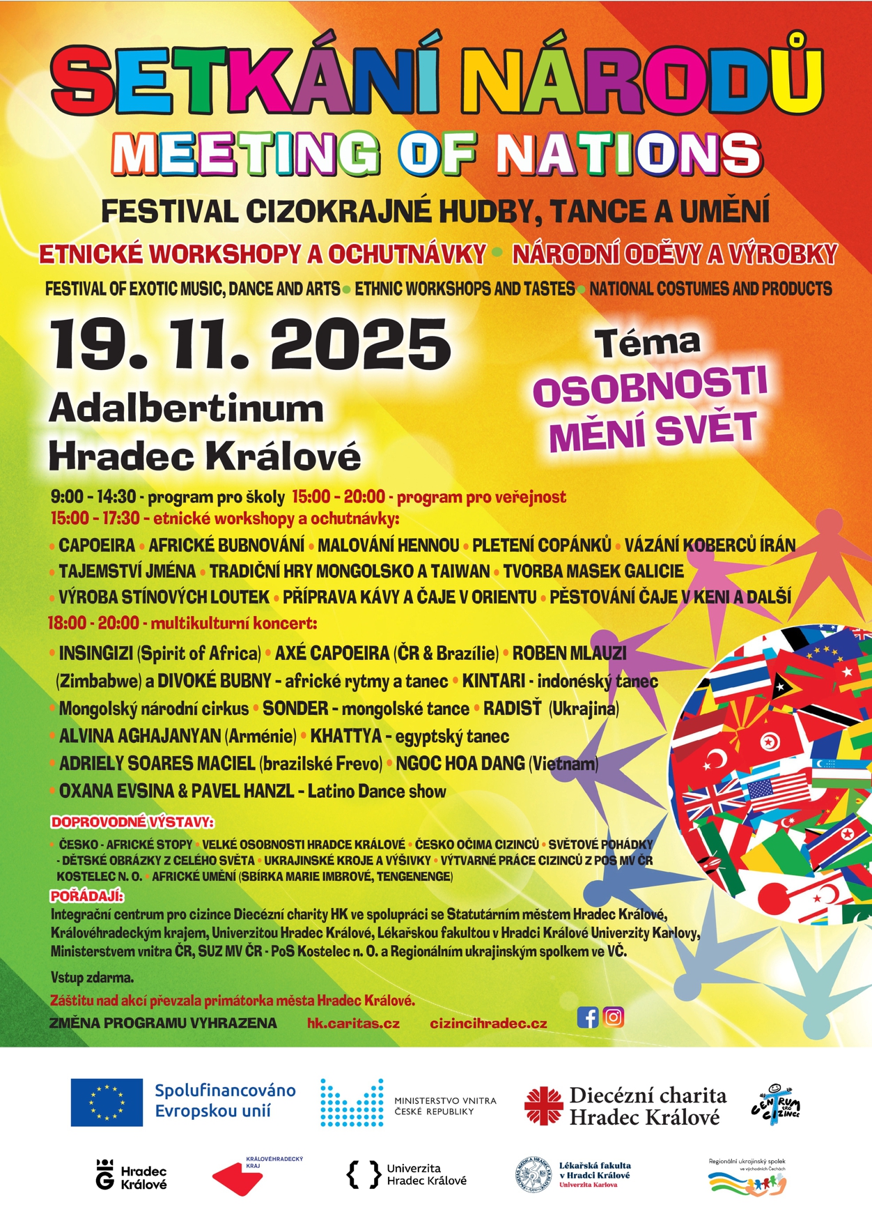 9:00 – 14:30 - PROGRAM PRO ŠKOLY • 15:00 – 20:00 - PROGRAM PRO VEŘEJNOST 15:00 – 17:30 – etnické workshopy a ochutnávky: CAPOEIRA • AFRICKÉ BUBNOVÁNÍ • MALOVÁNÍ HENNOU • PLETENÍ COPÁNKŮ • TAJEMSTVÍ JMÉNA • TRADIČNÍ HRY MONGOLSKO A TAIWAN • VÝROBA STÍNOVÝCH LOUTEK • TVORBA MASEK GALICIE • VÁZÁNÍ KOBERCŮ ÍRÁN • PŘÍPRAVA KÁVY A ČAJE V ORIENTU • PĚSTOVÁNÍ ČAJE V KENI A DALŠÍ 18:00 - 20:00 multikulturní koncert: INSINGIZI (Spirit of Africa) • AXÉ CAPOEIRA (ČR & Brazílie) • ROBEN MLAUZI (Zimbabwe) a DIVOKÉ BUBNY – africké rytmy a tanec • KINTARI - indonéský tanec • Mongolský národní cirkus • SONDER – mongolské tance • NGOC HOA DANG (Vietnam) • ALVINA AGHAJANYAN (Arménie) • KHATTYA – egyptský tanec • ADRIELY SOARES MACIEL (brazilské Frevo) • OXANA EVSINA & PAVEL HANZL – Latino Dance show • RADISŤ (Ukrajina) DOPROVODNÉ VÝSTAVY: ČESKO - AFRICKÉ STOPY • VELKÉ OSOBNOSTI HRADCE KRÁLOVÉ • ČESKO OČIMA CIZINCŮ • SVĚTOVÉ POHÁDKY - DĚTSKÉ OBRÁZKY Z CELÉHO SVĚTA • UKRAJINSKÉ KROJE A VÝŠIVKY • VÝTVARNÉ PRÁCE CIZINCŮ Z POS MV ČR KOSTELEC N. O. • AFRICKÉ UMĚNÍ (SBÍRKA MARIE IMBROVÉ, TENGENENGE) POŘÁDAJÍ: Integrační centrum pro cizince Diecézní charity HK ve spolupráci se Statutárním městem Hradec Králové, Královéhradeckým krajem, Univerzitou Hradec Králové, Lékařskou fakultou v Hradci Králové Univerzity Karlovy, Ministerstvem vnitra ČR, SUZ MV ČR - PoS Kostelec n. O. a Regionálním ukrajinským spolkem ve VČ. Záštitu nad akcí převzala primátorka města Hradec Králové. Vstup zdarma (změna programu vyhrazena). Těšíme se na setkání s vámi! Více na www.hk.caritas.cz a www.cizincihradec.cz. Sledujte nás také na facebooku a sdílejte událost i se svými přáteli!