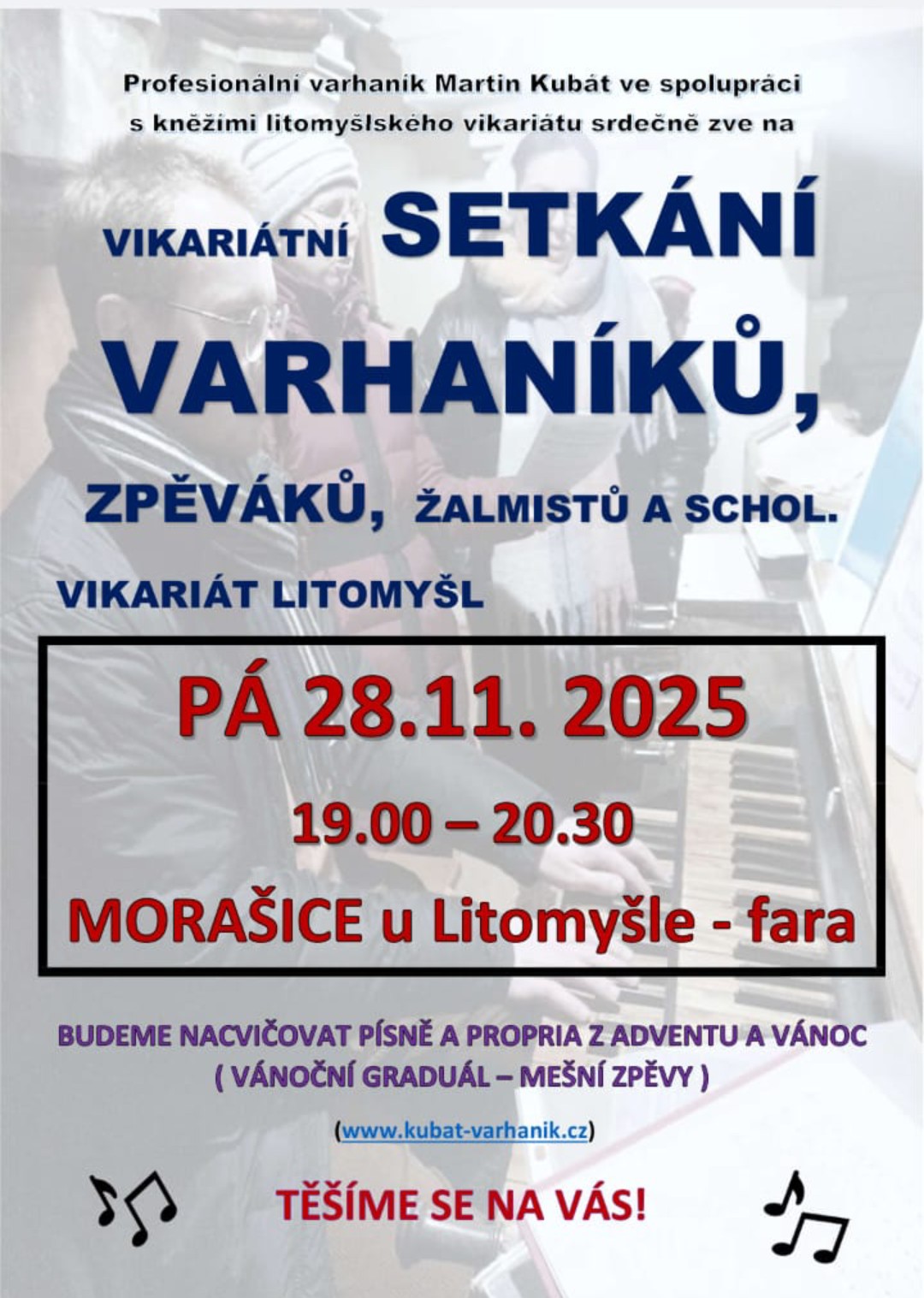 Setkání varhaníků a zpěváků ke společnému nácviku liturgických zpěvů z období Adventu a Vánoc.