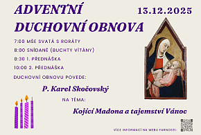 Srdečně zveme na adventní duchovní obnovu s tématem KOJÍCÍ MADONA A TAJEMSTVÍ VÁNOC, kterou povede P. Karel Skočovský.
