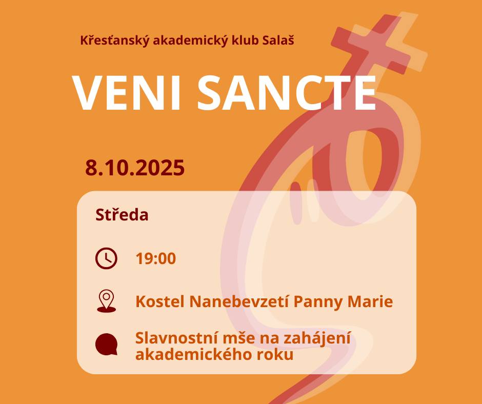 Zveme Tě na studentskou mši Veni Sancte, kterou společně vkročíme do nového akademického roku. Přijď načerpat klid a požehnání do dalšího studia, poznat nové tváře a odstartovat semestr v nejlepší společnosti. Po mši Tě čeká přátelské posezení s drobným občerstvením a tradiční pasování nových členů! Buď u toho s námi!