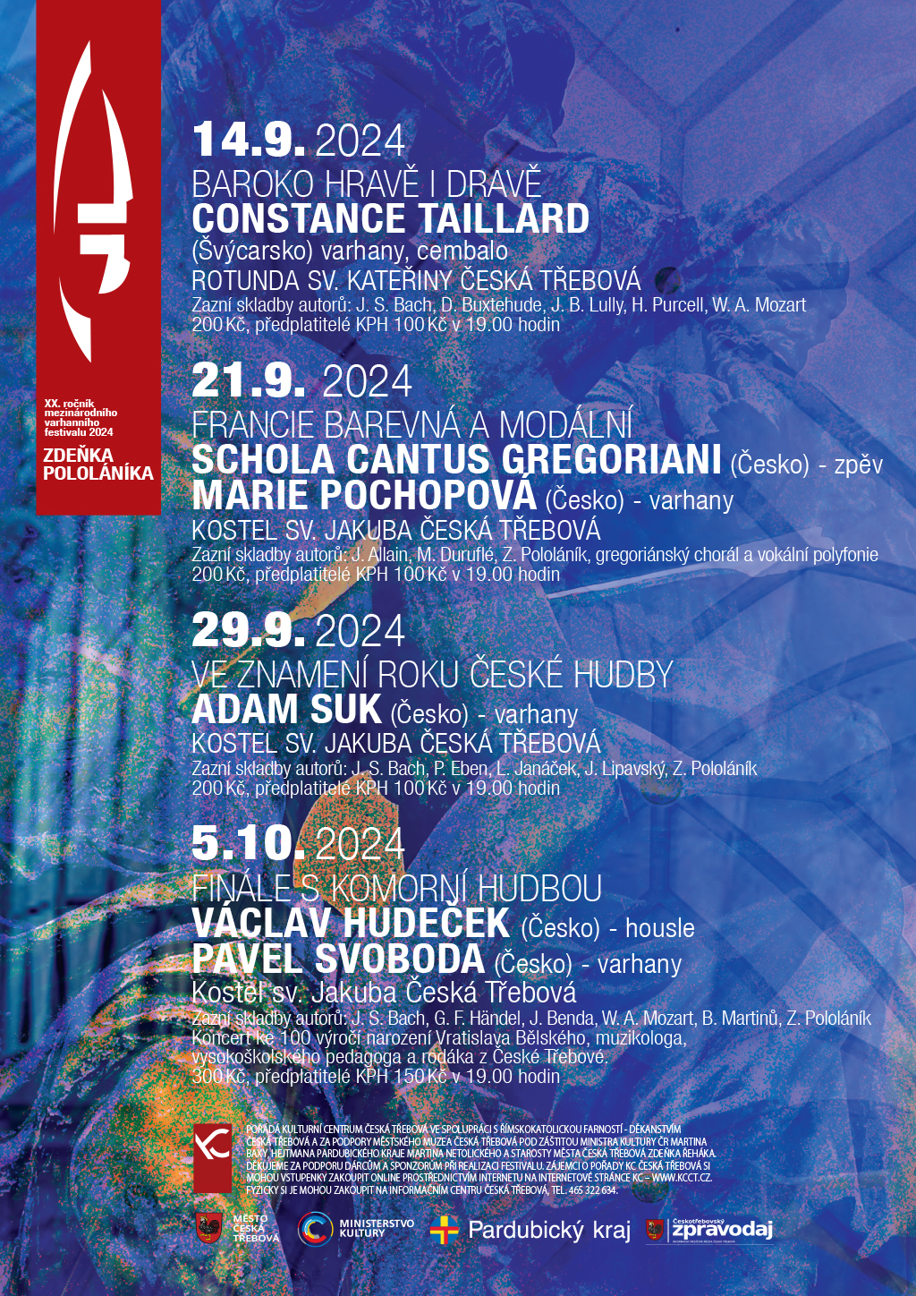 „Finále s komorní hudbou“ – tak se jmenuje závěrečný koncert, který v kostele sv. Jakuba proběhne 5. 10. 2024. Vystoupí na něm houslový virtuóz Václav Hudeček a varhanní virtuóz Pavel Svoboda. Zazní J. S. Bach, G. F. Händel, J. Benda, W. A. Mozart, B. Martinů či Z. Pololáník. Koncert je navíc připomenutím 100. výročí narození českotřebovského rodáka, vynikajícího varhaníka, cembalisty, pedagoga a interpreta Vratislava Bělského.