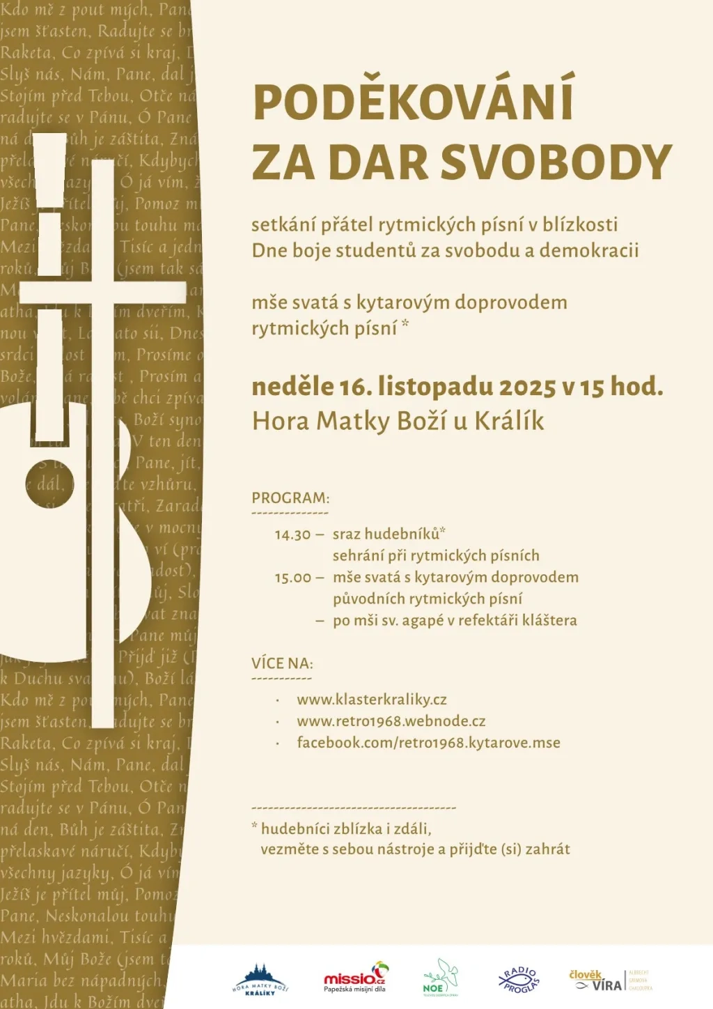 Hudební doprovod obstará rytmická schola kostela Nanebevzetí Panny Marie z Hradce Králové společně s vámi všemi, milí muzikanti, kteří se přidáte se svým hudebním nástrojem – jste srdečně zváni a vřele vítáni.