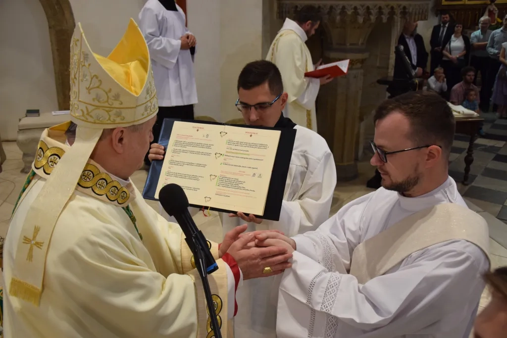 "Pamatujte na to, že všechny potřebné milosti vám budou dány. Dostanete mimořádné dary Ducha Svatého, které vás budou každým dnem provázet. Nikdo z nás si toto Boží povolání nijak nezasloužil. Ne, my Jeho, ale to On si vyvolil nás, aby nás povolal na tuto cestu. Chci zdůraznit jeden z nejdůležitějších znaků kněžství, kterým je modlitba. Proměňuje-li se ve svátostném svěcení podstata vaší duše, nutně se musí proměnit a zintenzívnit i vaše modlitba – jako výraz živého vztahu s Trojjediným Bohem. A to po vzoru Panny Marie, které vás dnes zasvěcuji a jí vás svěřuji", řekl diecézní biskup Jan Vokál ve své promluvě ke svěcencům bezprostředně před jejich přijetím svátosti kněžství, a dodal, že podle svatého Jana Pavla II. musí být kněžství nejen modlitbou provázeno, ale dokonce zakořeněno v modlitbě, která odpovídá kněžské existenci a identitě.