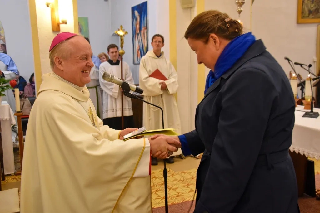 Národní prezidentka Fatimského apoštolátu v ČR Hana Frančáková předala ocenění a poděkování také Mons. Janu Vokálovi, královéhradeckému biskupovi.