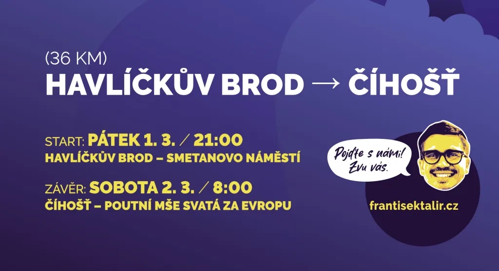 KDY A KDE? Sejdeme se v pátek 1. března ve 20:00 hod. Café Art OKO (Smetanovo náměstí 30) v Havlíčkově Brodě a vyrazíme zhruba o hodinu později. Putování zakončíme v Číhošti mší svatou od 8:00.