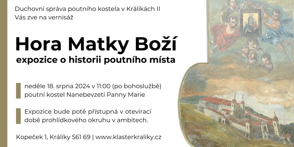 Duchovní správa poutního kostela na Hoře Matky Boží u Králík otevře v neděli 18. srpna 2024 po hlavní poutní bohoslužbě novou expozici o historii poutního místa. Expozice je součástí prohlídkového okruhu, který se nachází v ambitech.