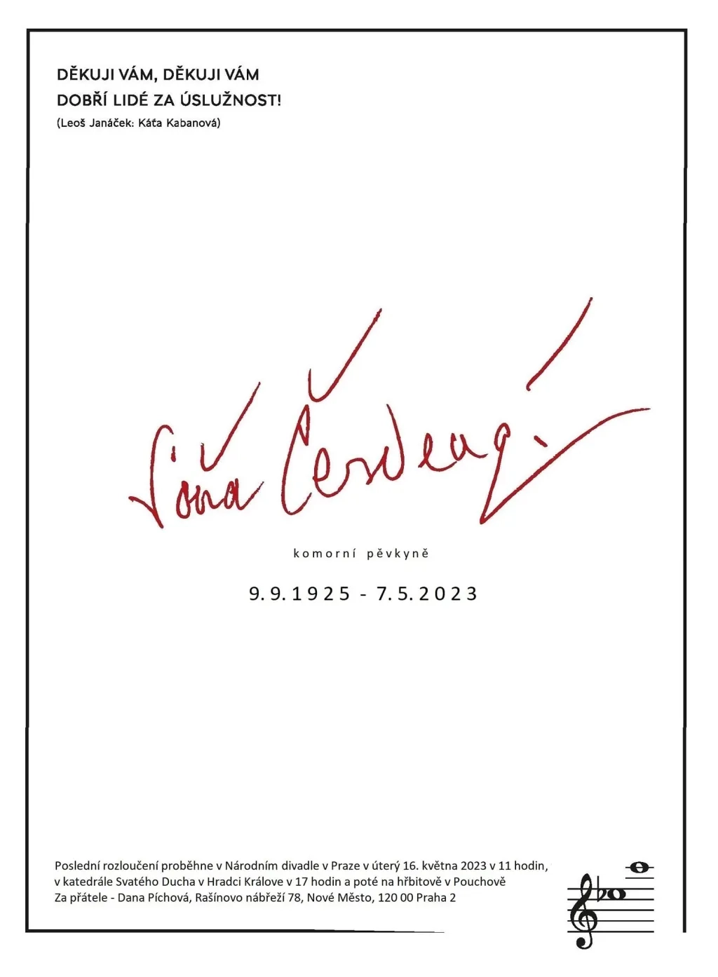 Zádušní mši svatou bude v úterý 16. 5. v 17 hod. v katedrále Svatého Ducha v Hradci Králové celebrovat královéhradecký biskup Mons. Jan Vokál. Po pohřebních obřadech bude zesnulá Soňa Červená uložena na hradeckém, pouchovském hřbitově do rodinné hrobky Červených.