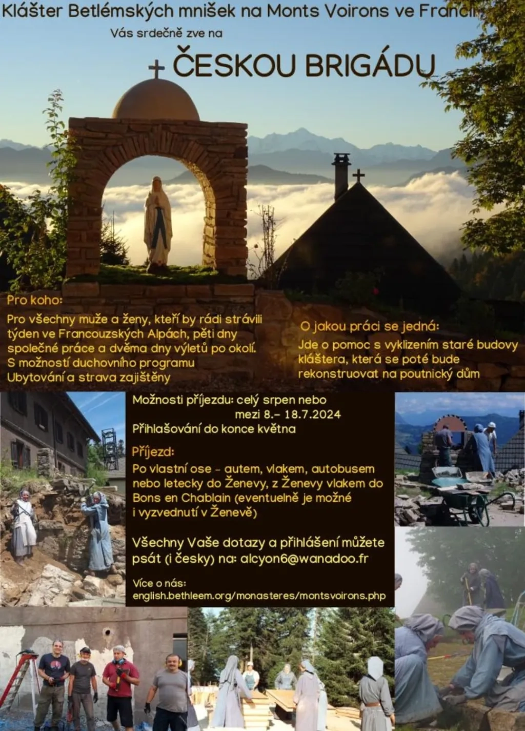 Klášter Monts Voirons, nedaleko Ženevského jezera, je jedním z nejstarších klášterů Betlémských mnišek. V současnosti potřebuje zásadnější rekonstrukci. Betlémské mnišky prosí ochotné lidi o pomoc s různými pracemi při opravách jejich rozlehlého domu. Informace o možné pomoci s opravou kláštera najdete níže na plakátku.