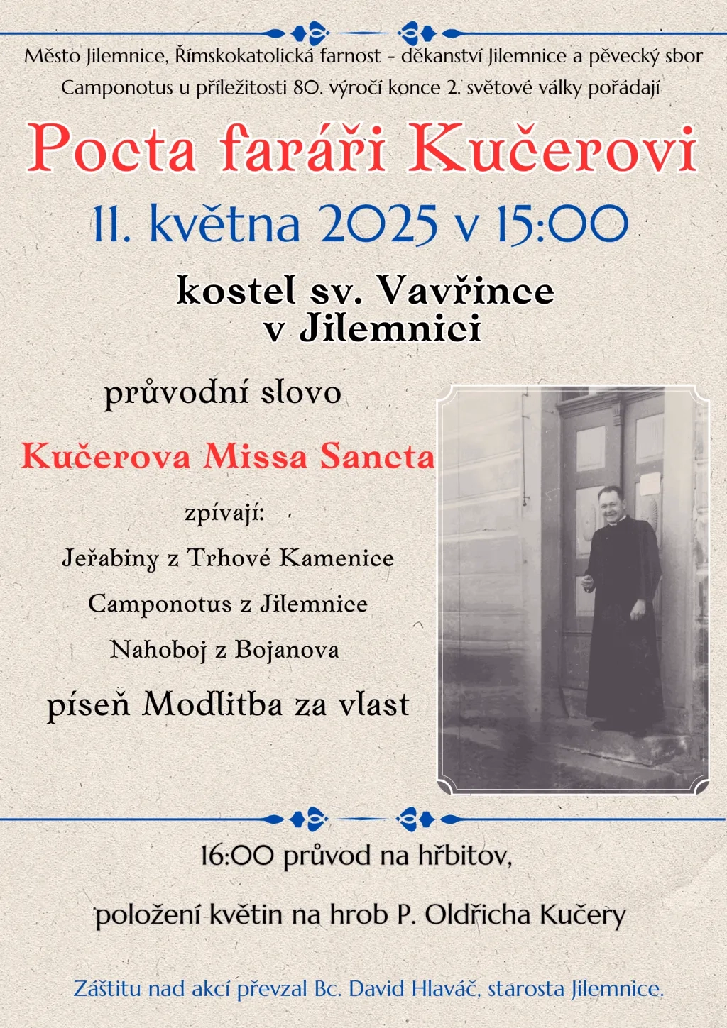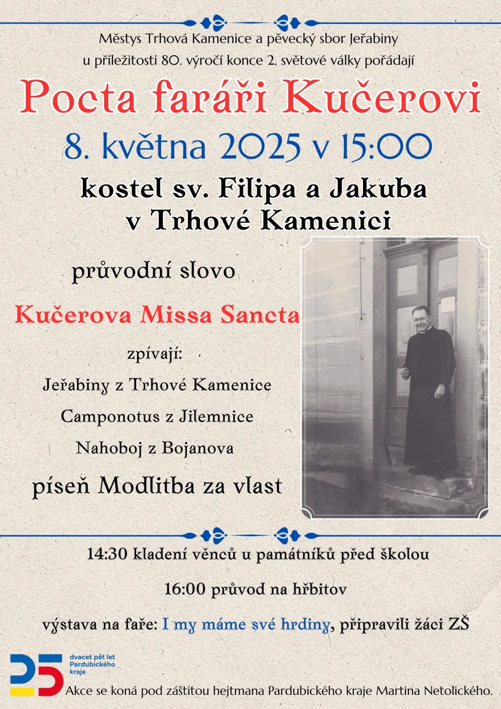 U příležitosti osmdesátiletého výročí konce druhé světové války pořádá městys Trhová Kamenice a pěvecký sbor Jeřabiny akci Pocta faráři Kučerovi.