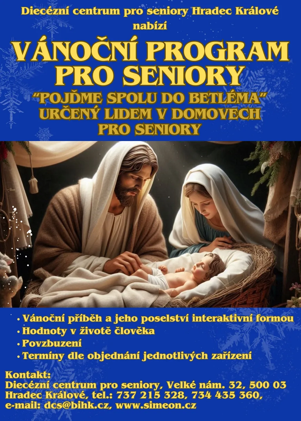 Diecézní centrum pro seniory nabízí interaktivní vánoční program s názvem Pojďme spolu do Betléma, určený lidem v domovech pro seniory a obdobných zařízeních, které poskytují sociální služby seniorům. Program trvající cca 45 minut zahrnuje seznámení s vánočním příběhem, besedu a společnou reflexi. Metodické materiály k programu poskytlo Katechetické a pedagogické centrum Biskupství královéhradeckého. Hlavním cílem této aktivity je oživení a porozumění smyslu vánočního příběhu a jeho poselství, reflektování hodnot v životě člověka a povzbuzení lidí seniorského věku.