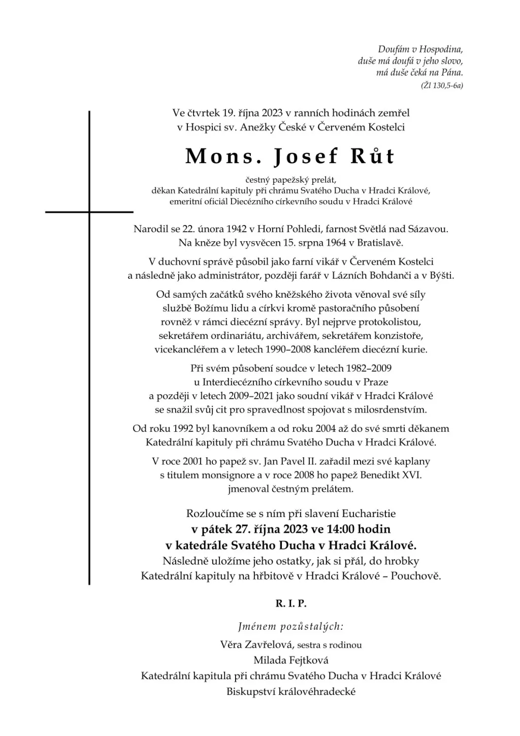 Ve čtvrtek 19. října 2023 v ranních hodinách zemřel v Hospici sv. Anežky České v Červeném Kostelci Mons. Josef Růt, čestný papežský prelát, děkan Katedrální kapituly při chrámu Svatého Ducha v Hradci Králové, emeritní oficiál Diecézního církevního soudu v Hradci Králové.