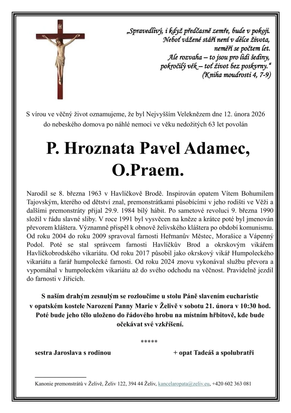 P. Hroznata Pavel Adamec, O.Praem se narodil 8. března 1963 v Havlíčkově Brodě. Inspirován opatem Vítem Bohumilem Tajovským, kterého od dětství znal, premonstrátkami působícími v jeho rodišti ve Věži a dalšími premonstráty přijal 29.9. 1984 bílý hábit. Po sametové revoluci 9. března 1990 složil v řádu slavné sliby. V roce 1991 byl vysvěcen na kněze a krátce poté byl jmenován převorem kláštera. Významně přispěl k obnově želivského kláštera po období komunismu.