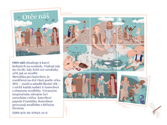 9 karet plných symbolů, které nás vtahují do chvíle, kdy Ježíš své učedníky učil, jak se modlit. Metodika je vypracována pro mladší a straší děti. Každá nabízí 11 katechezí s tématem modlitby. Výrazným inspiračním zdrojem byl autorkám cyklus katechezí papeže Františka. Katecheze provazují modlitbu s běžným životem.