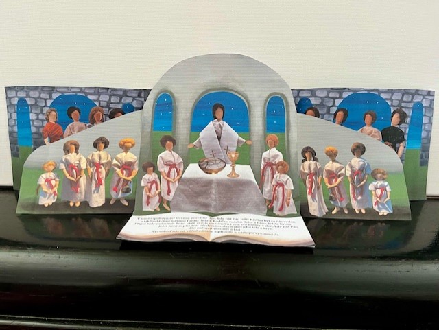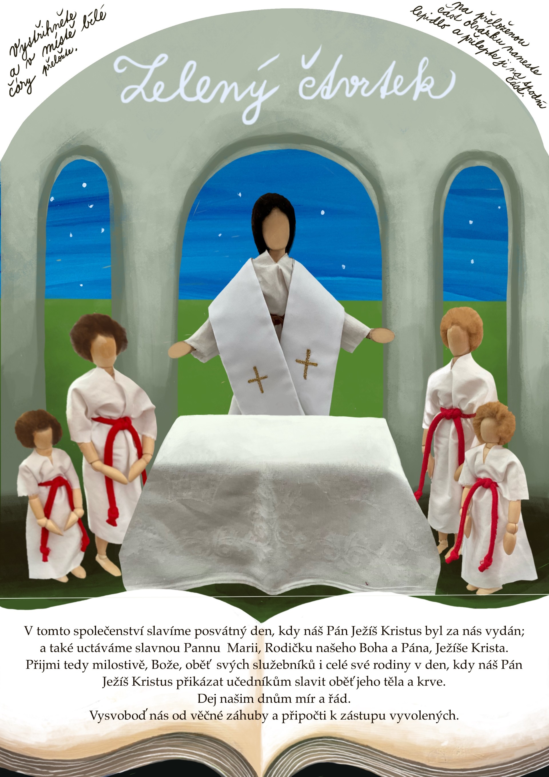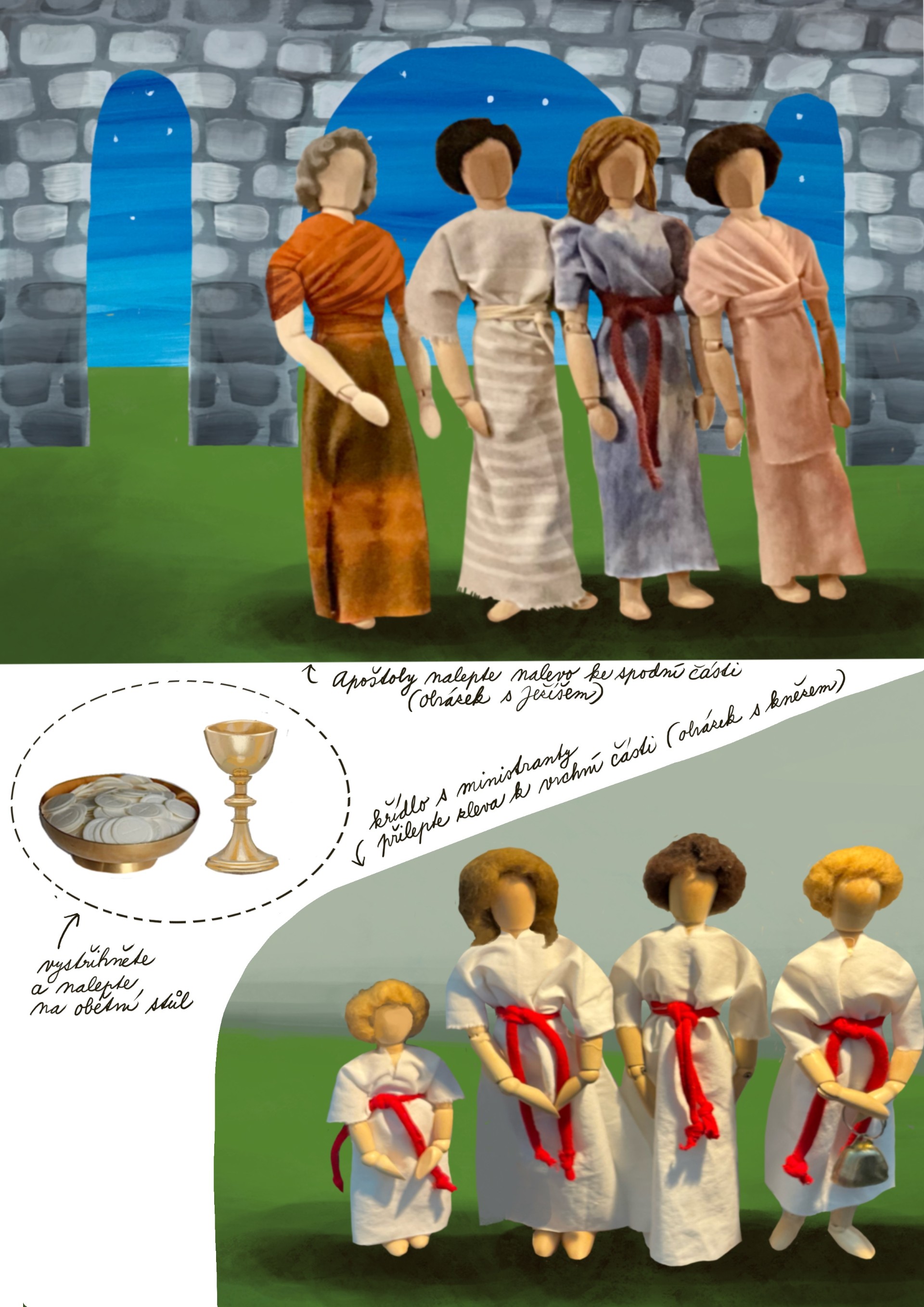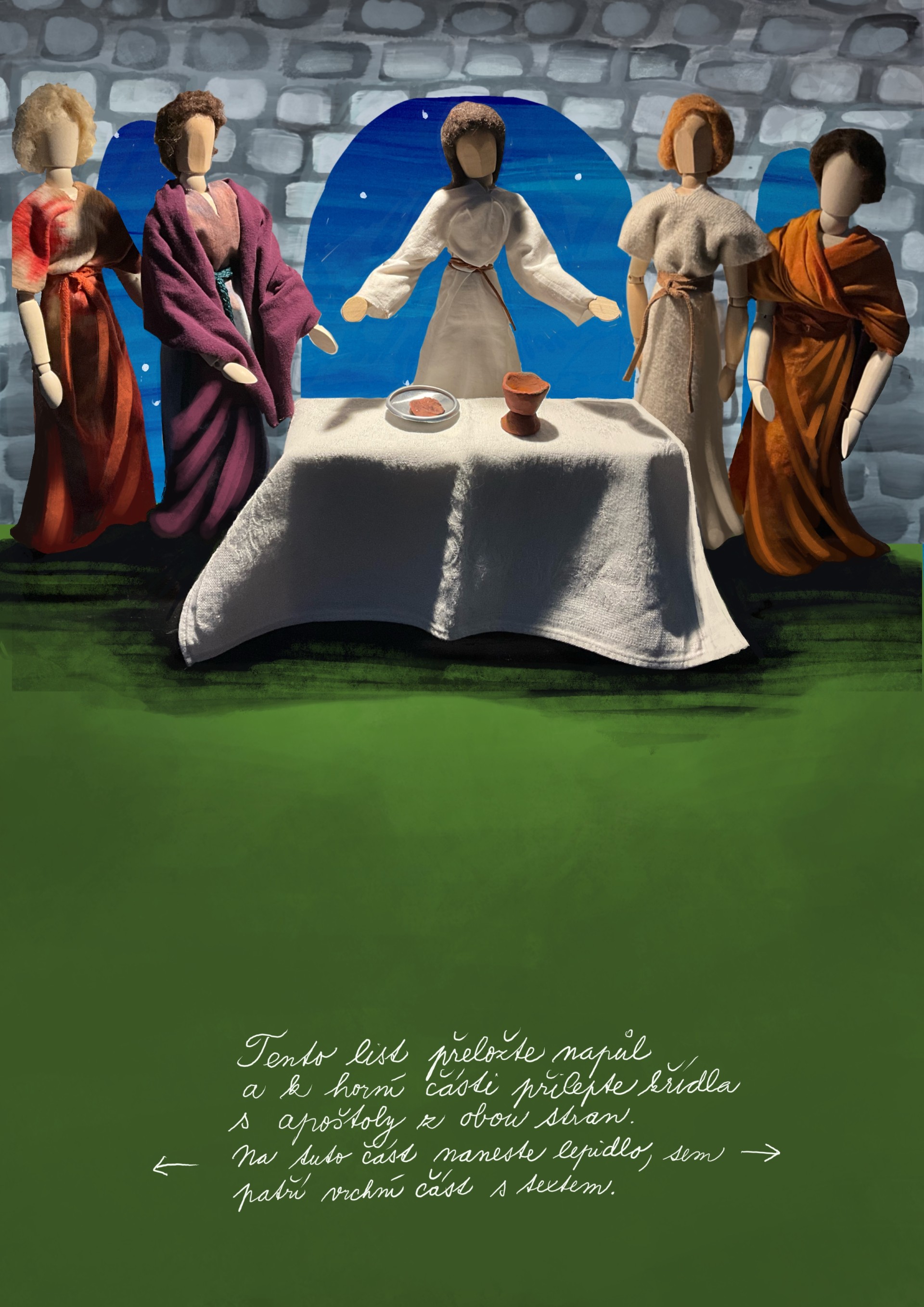 | Poslední večeře | Při prezentaci poslední večeře malým dětem doporučujeme vyrobit si překližky nebo z kartonu jeho malý model se stolkem a pořídit si 13 figurek (Ježíš a apoštolové). Dále potřebujeme chléb a kalich s vínem a biblický text. | Metodika pro děti předškolního věku Biblický text k výrobě knížečky pro děti |