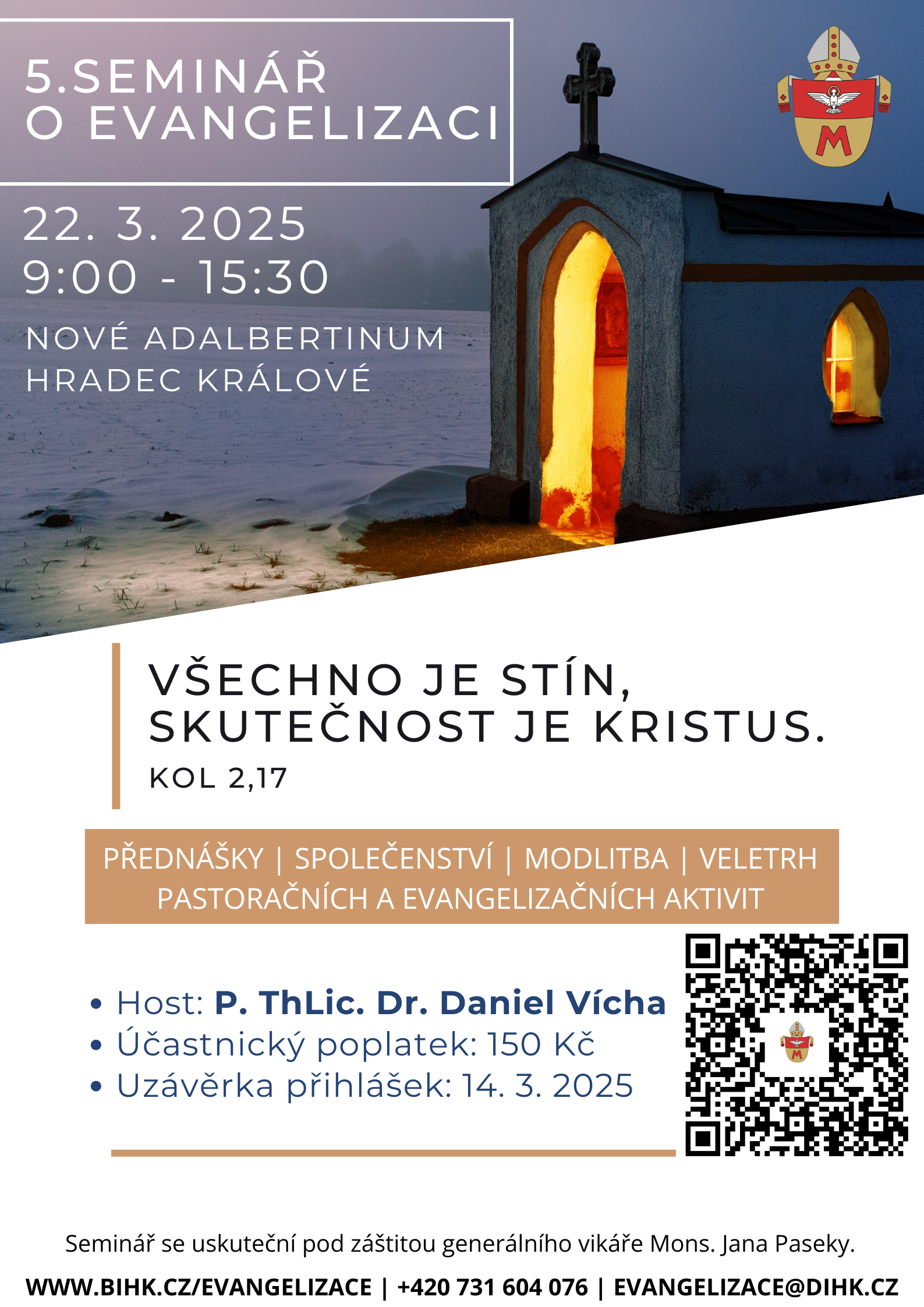 Hlavním hostem 5. semináře o evangelizaci je P. ThLic. dr. Daniel Vícha, biskupský vikář pro pastoraci, evangelizaci a vzdělávání Biskupství ostravsko-opavského. Motem dopoledního programu je verš z listu Kolosanům 2,17: